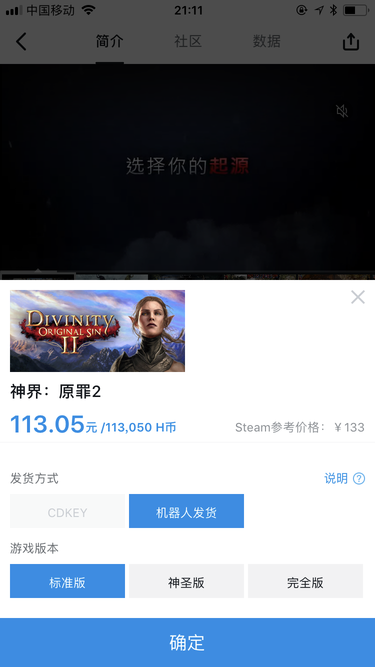 4.我們選擇一個游戲點擊進(jìn)去購買試試,可以看到《神界:原罪2》的Steam價格是133,在小黑盒上只需要113即可購買。